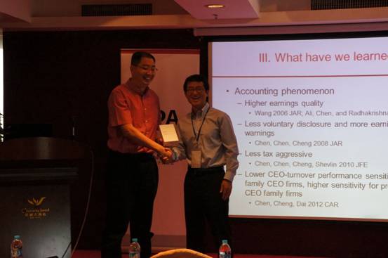 另外,来自新加坡管理大学的程强教授做了题为“Family Firm Research”的主题演讲。程强教授全面地介绍了美国家族企业的特征及已有的家族企业研究成果。程强教授认为,相比其他大股东来说,家族成员具有股权更加集中、所有权多样化程度较低、投资期限更长、积极参与企业管理等特点,这使得家族成员有更强的动机和更好的方式来影响公司决策。接着,程强教授从估值溢价、代理成本和会计问题的角度详细地介绍了已有的关于家族企业的研究。程强教授的演讲让与会者清晰地了解了美国家族企业研究现状,以及中国家族企业的特殊性,为未来家族企业的研究起到推动作用。