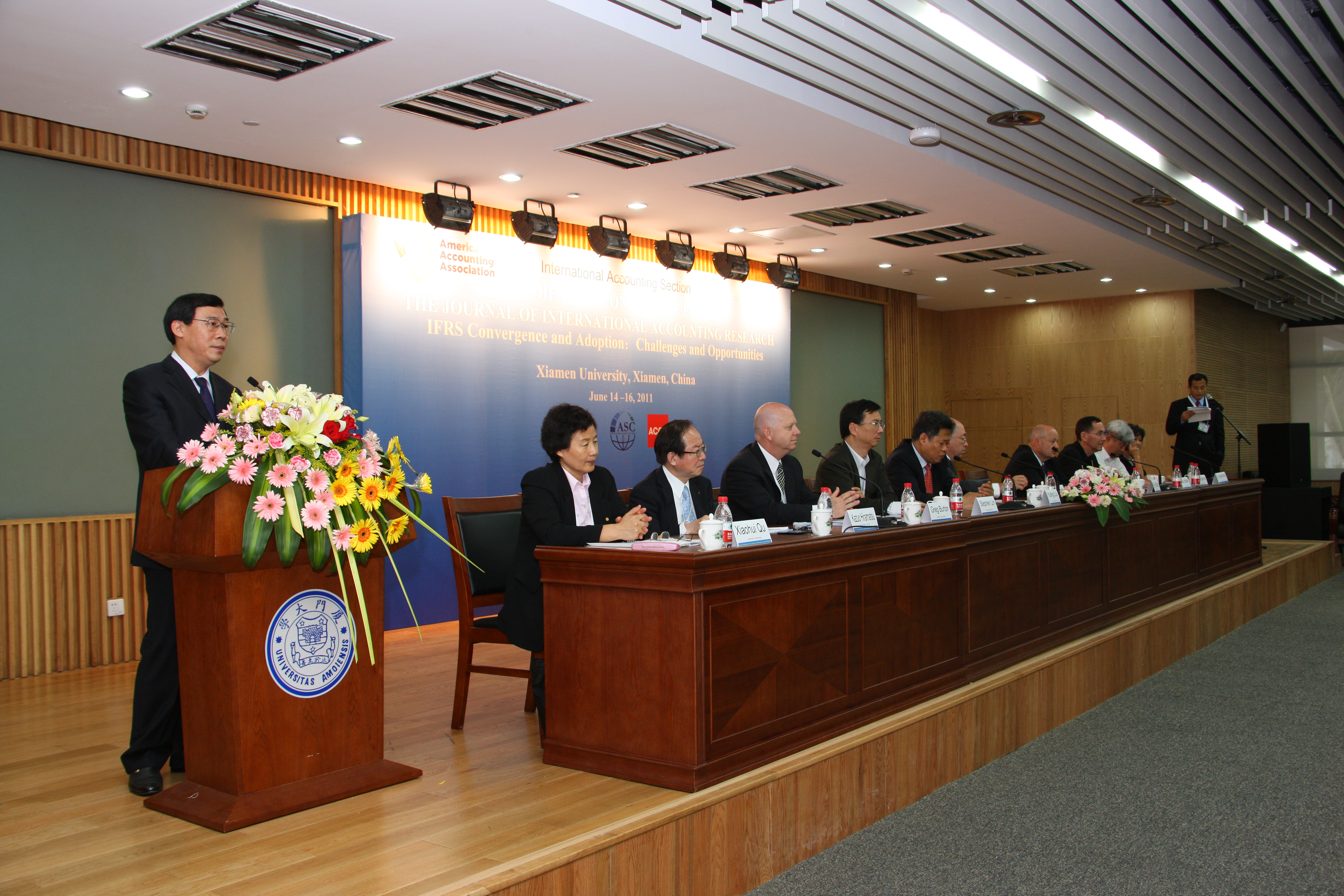 随着世界经济一体化和资本市场全球化的发展,国际财务报告准则趋同问题受到世界各国普遍关注。目前,国际财务报告准则已经在一百多个国家采用或者作为制定本国会计准则的基础。针对当前国际形势,为更好地解决国际财务报告准则趋同所存在的各种问题,加强各国学者的交流与合作,促进财务与会计研究深入发展,更好地为会计理论和实务提供增量贡献,由美国会计学会和中国会计学会联合主办,普通高等学校人文社会科学重点研究基地厦门大学会计发展研究中心、国家“985工程”哲学社会科学创新平台厦门大学财务管理与会计研究院和国家重点学科厦门大学管理学院会计系联合承办的《国际会计研究学刊》首届年会——国际财务报告准则趋同与采用:机遇和挑战(The first conference for the Journal of International Accounting Research, Theme: IFRS Convergence and Adoption: Challenges and Opportunities)”,于2011年6月15日在厦门大学科艺中心隆重开幕。