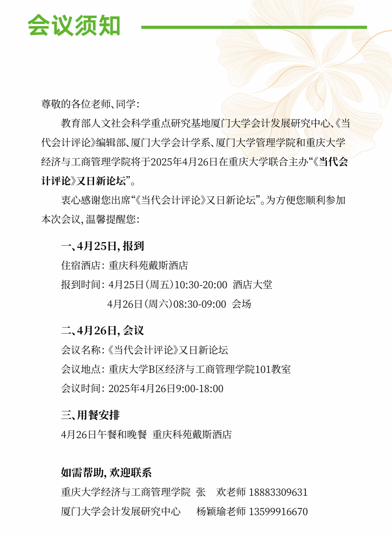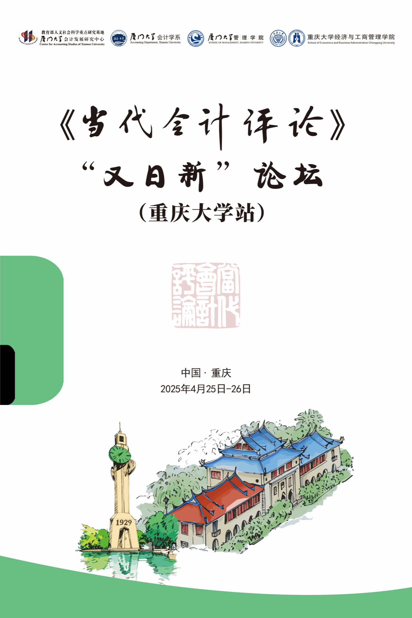 教育部人文社会科学重点研究基地厦门大学会计发展研究中心、《当代会计评论》编辑部、厦门大学会计学系、厦门大学管理学院和重庆大学经济与工商管理学院联合主办的“《当代会计评论》又日新论坛”将于2025年4月25日-26日在重庆大学举办。我们期望通过贴近作者、贴近读者的活动方式,激发会计研究创新,搭建您身边的学术平台。