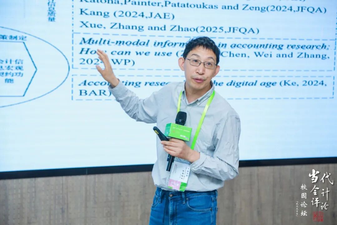 李青原教授以“公司财务会计研究交叉创新的思考”为题作报告,从学科融合与方法创新的角度系统阐述了财务会计研究的发展方向。李教授指出,随着人工智能、大数据等新技术的兴起,传统的财务会计研究正向与经济学、社会学、政治学与心理学等理论框架结合的跨学科整合转变,并以多篇经典研究为例,展示了法律变迁、政治周期、税收政策及ESG信息披露等议题如何推动学科交叉创新,同时强调方法论更新的重要性,如机器学习、多模态数据分析等。最后,呼吁学者立足中国制度实践,做好中国研究,构建具有中国特色的财务会计知识体系,实现理论与政策的双向互动。