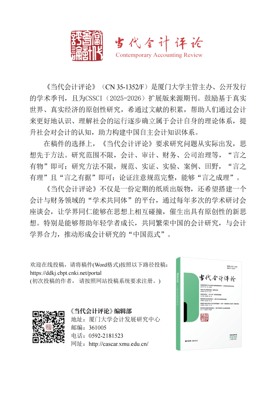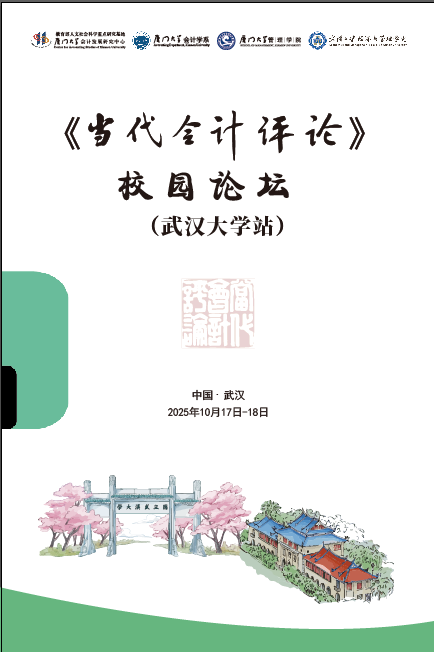 教育部人文社会科学重点研究基地厦门大学会计发展研究中心、《当代会计评论》编辑部、厦门大学会计学系、厦门大学管理学院、武汉大学经济与管理学院会计系和武汉大学财务与会计研究所将于2025年10月17日-18日在武汉大学联合主办 “《当代会计评论》校园论坛(武汉大学站)”。我们期望通过贴近作者、贴近读者的活动方式,激发会计研究创新,搭建您身边的学术平台。