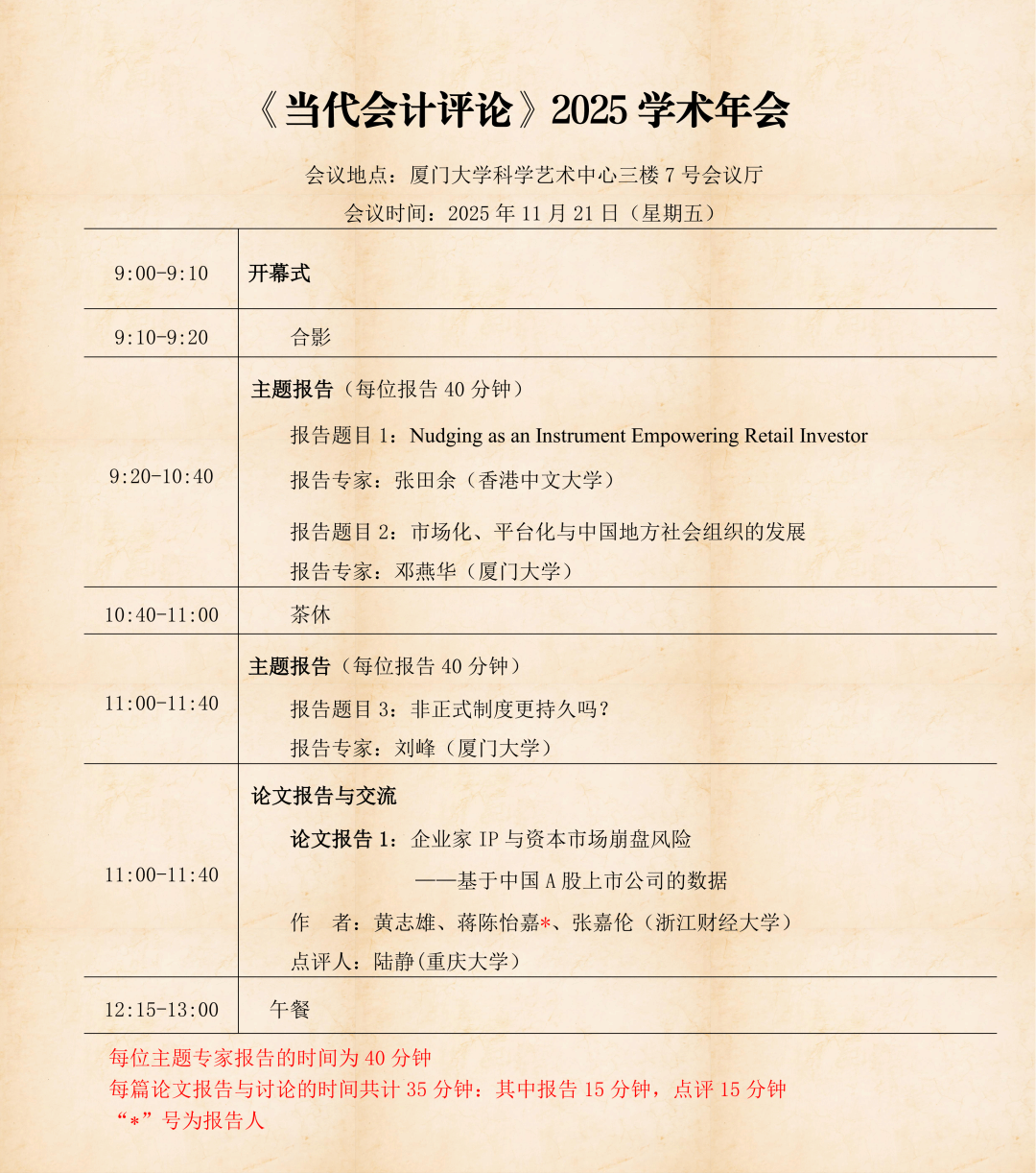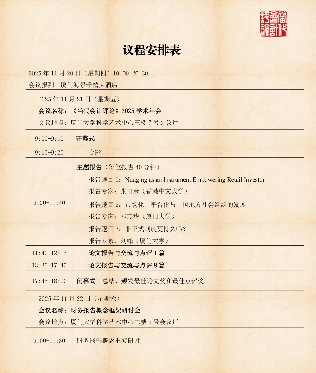 教育部人文社会科学重点研究基地厦门大学会计发展研究中心、《当代会计评论》编辑部和厦门大学会计学系将于2025年11月20-21日在厦门大学联合主办“《当代会计评论》2025学术年会”。