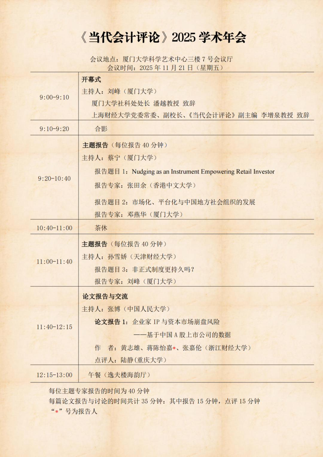 教育部人文社会科学重点研究基地厦门大学会计发展研究中心、《当代会计评论》编辑部和厦门大学会计学系将于2025年11月20-21日在厦门大学联合主办“《当代会计评论》2025学术年会”。