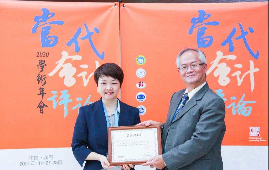 通过论文评审委员组投票,本次学术研讨会的最佳论文奖和最佳评论奖的获得者分别是最佳论文奖授予湖南大学陈敏副教授(报告论文:政策不确定性提高了审计收费吗?);最佳点评奖授予澳门科技大学张昊旻教授(点评论文:关键审计事项与非机会主义盈余管理)。澳门科技大学副校长兼商学院院长苏育洲教授颁发了奖励证书。