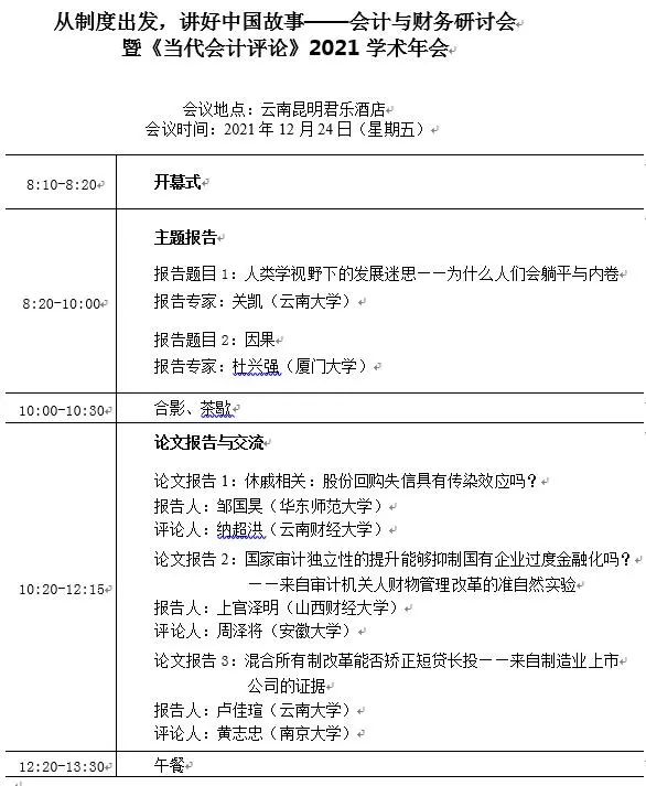 从制度出发,讲好中国故事——会计与财务研讨会暨《当代会计评论》2021学术年会将于2021年12月23-24日在云南举行,本次会议由厦门大学会计发展研究中心、厦门大学管理学院会计学系和云南大学工商管理与旅游管理学院(会计学院)联合主办,并获得冠亚厦门大学会计学系发展基金的支持。