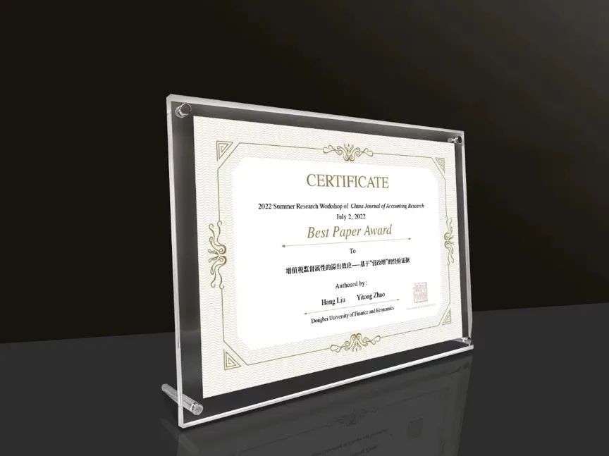 经过组委会评选,东北财经大学刘行教授和赵祎曈同学合著的论文《增值税监督属性的溢出效应——基于“营改增”的经验证据》荣获2022 CJAR Summer Research Workshop 最佳论文奖!