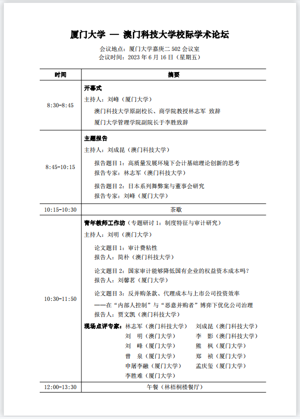 为加强厦门大学和澳门科技大学校际学术交流与合作,促进内地与澳门地区会计学及相关学科学术合作和智库开发,共同推动会计学学术研究的发展,由教育部人文社会科学重点研究基地厦门大学会计发展研究中心、澳门会计研究中心和厦门大学管理学院会计学系联合主办的“厦门大学-澳门科技大学校际学术论坛”于2023年6月16日(周五)在厦门大学举行。
