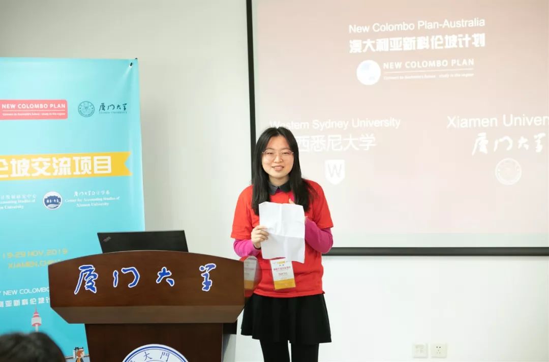 活动澳方发起人之一西悉尼大学商学院Dilupa博士上台致辞。她对厦门大学师生们对此次交流活动的大力支持和参与表示了诚挚的感谢,希望西悉尼大学同学们能够积极参与举办的各类活动,学有所得,不虚此行。