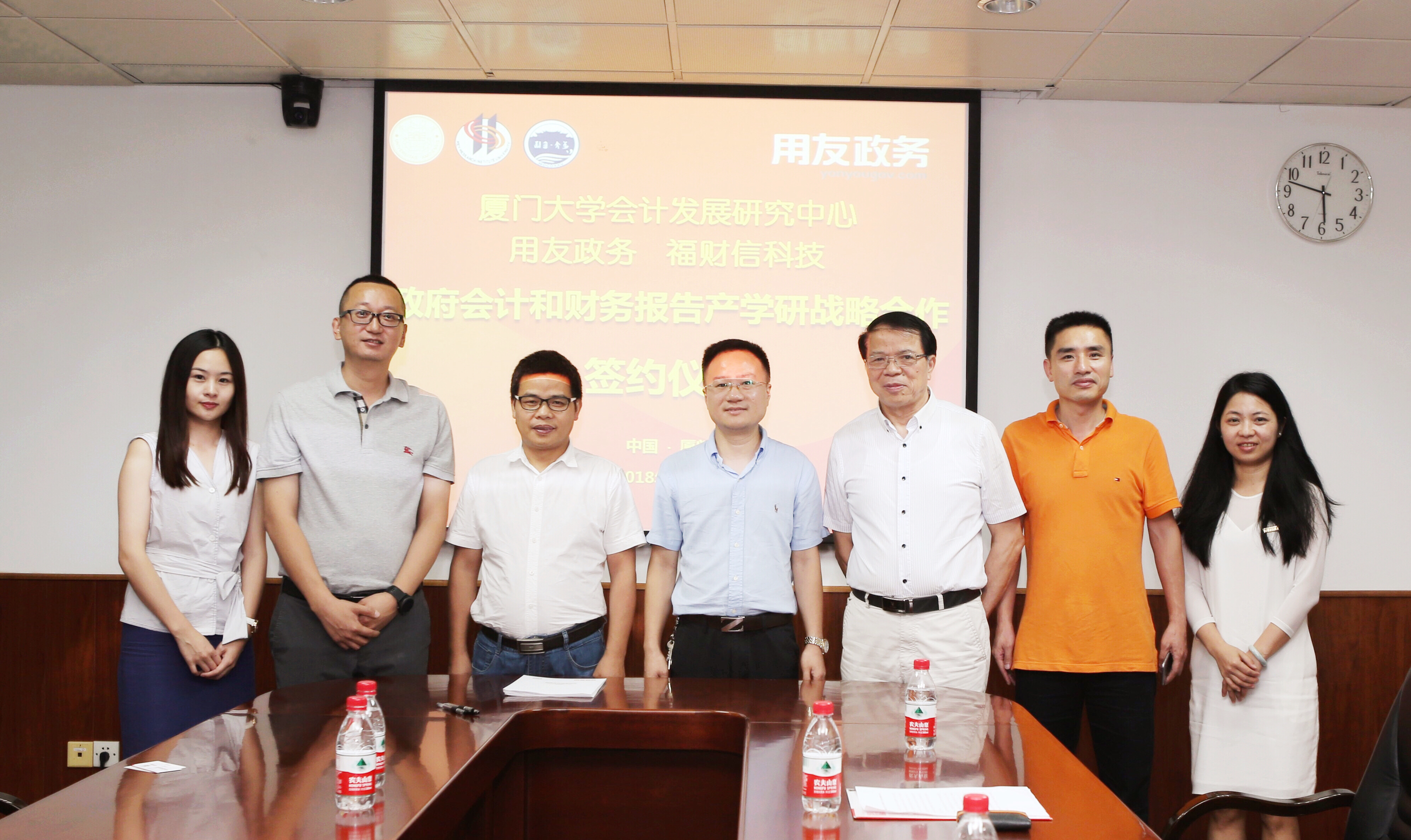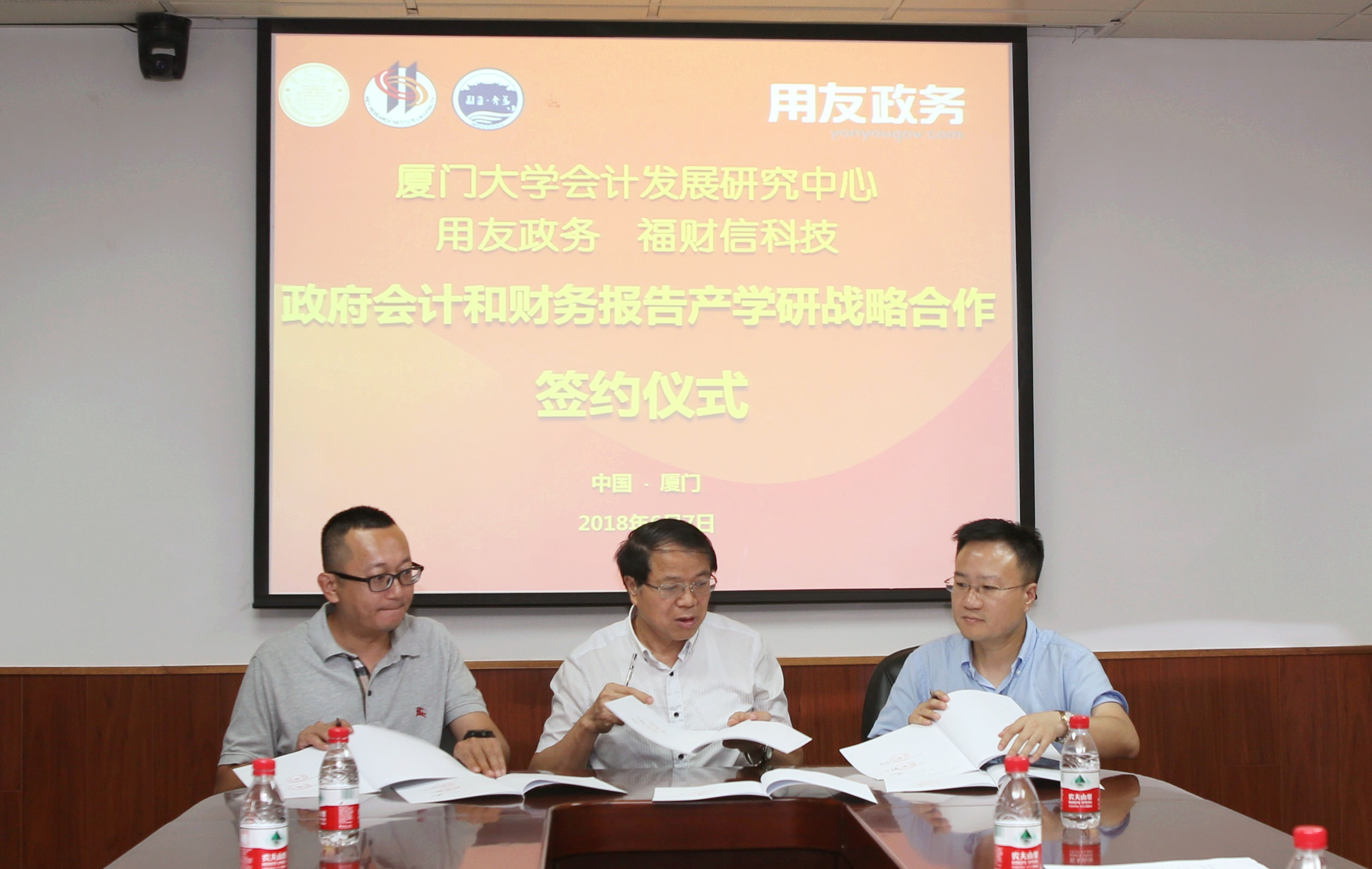 在国家治理体系、治理能力现代化建设和新《预算法》颁布实施大背景下,我国政府会计和财务报告改革正如火如荼地进行。政府会计准则和《政府会计制度》如何落地实施,是理论界和实务界迫切需要解决的问题。鉴于此,我中心与企业联合围绕政府会计准则制度实施等建立产学研协同创新平台,助推经济社会发展和国家善治。2018年6月7日,厦门大学会计发展研究中心与用友政务签署了校企战略合作协议。我中心副主任傅元略教授、管理学院会计系副主任张国清教授、用友政务软件有限公司曹勇强先生、福财信电脑科技有限公司吴进建先生参加了签约仪式。