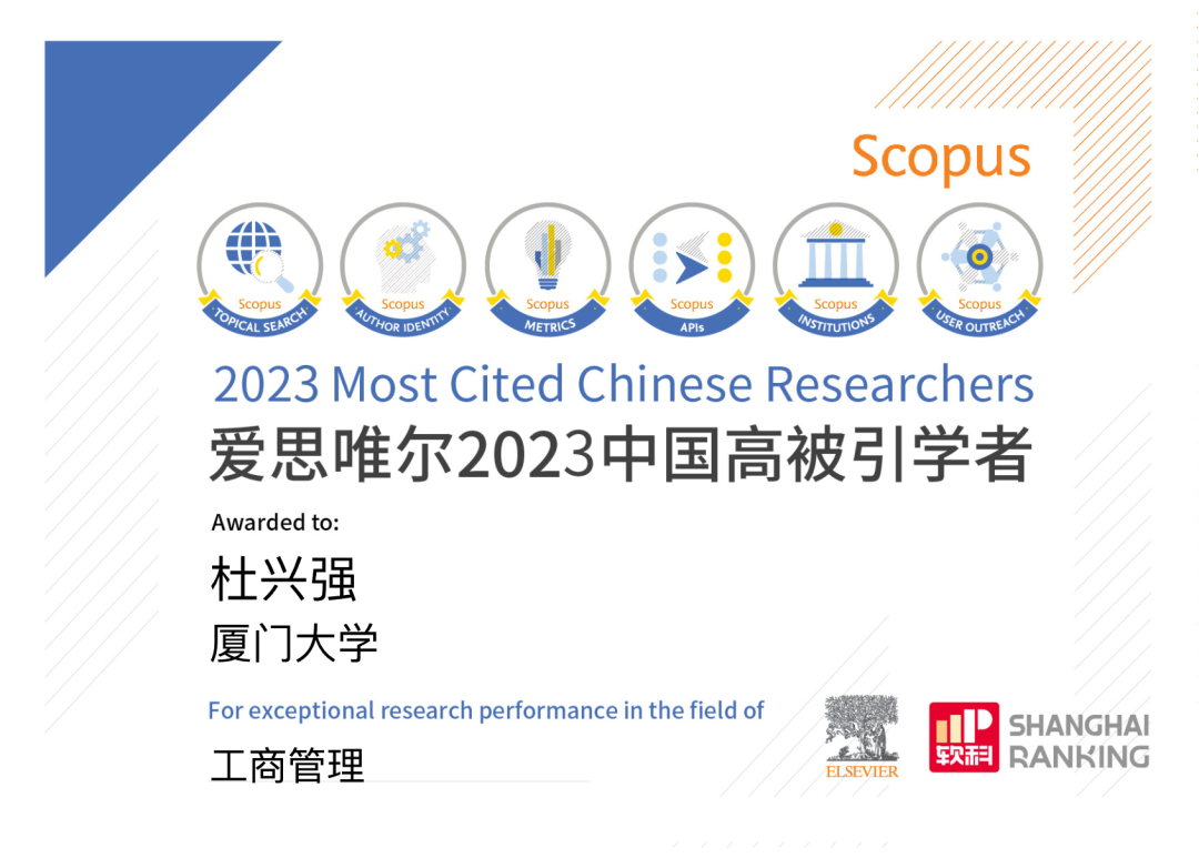 2024年3月27日,爱思唯尔(Elsevier) 发布了2023年“中国高被引学者”榜单,厦门大学会计学系/厦门大学会计发展研究中心杜兴强教授入选“爱思唯尔2023中国高被引学者”(工商管理)。