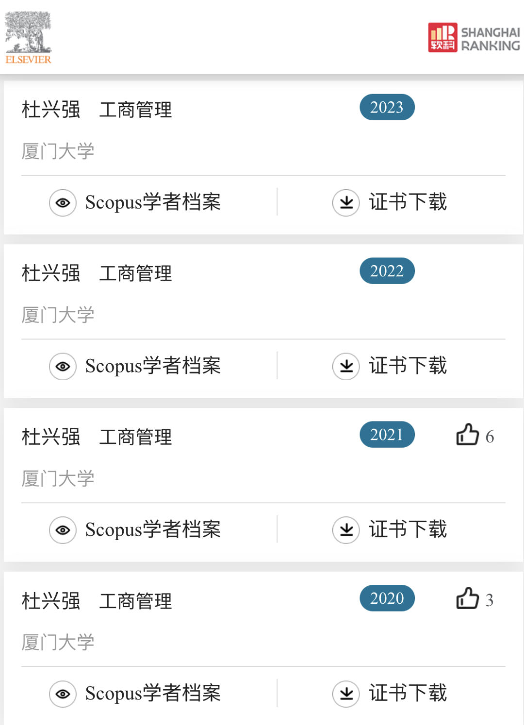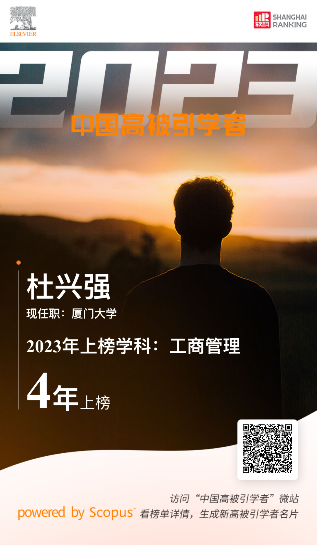 这是杜兴强教授自2020年、2021年和2022年之后,连续第四次入选“爱思唯尔中国高被引学者”(工商管理)。