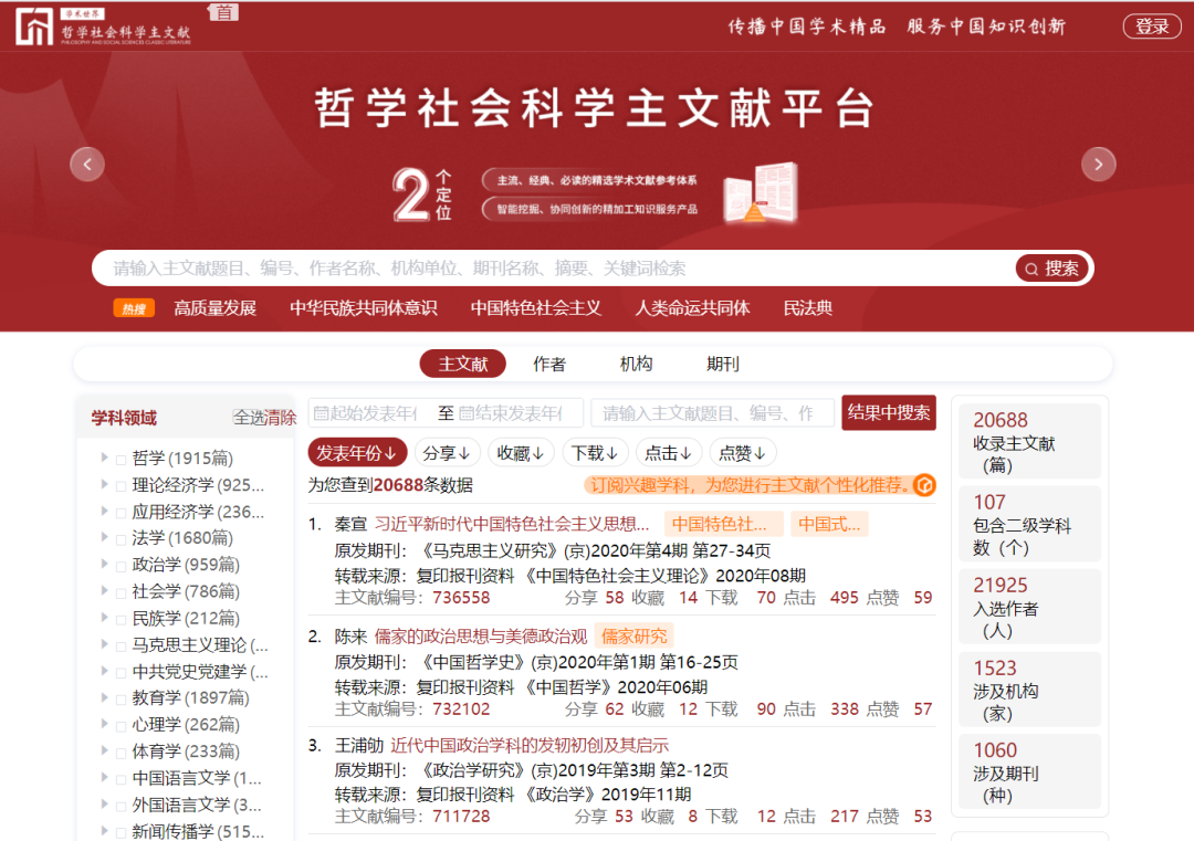 近期,由中国人民大学牵头建设、中国人民大学书报资料中心具体承建的“中国哲学社会科学自主知识体系数字创新平台”的“哲学社会科学主文献平台”,公布了第一批入选的2万余篇文献。
