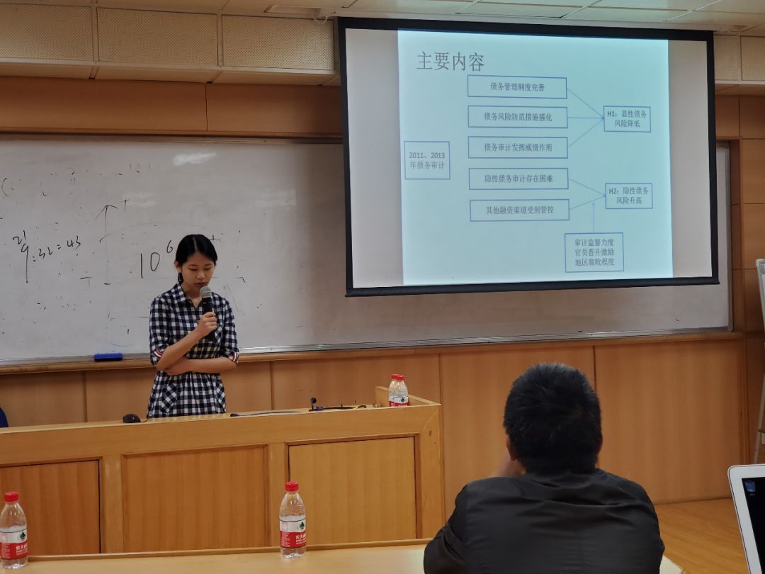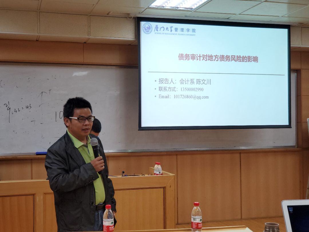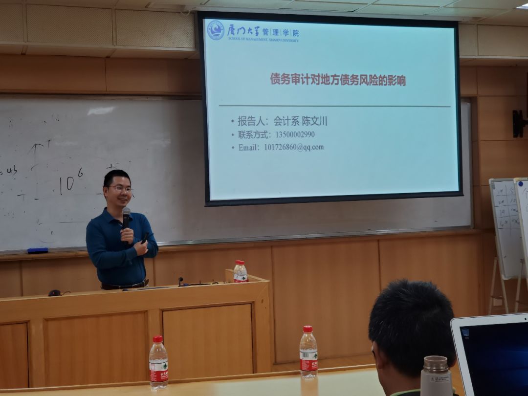 2019年10月22日下午,“厦门大学会计学科教师与研究生系列Seminar”之六十一在管理学院嘉庚二208教室举行。本次学术报告由我系副主任张国清教授主持,邀请的报告人是我系2019级博士研究生陈文川,他以“债务审计对地方政府债务风险的影响——基于2008~2016年省级面板数据的实证研究”为主题,给在场的老师和同学们做了一场精彩的报告。