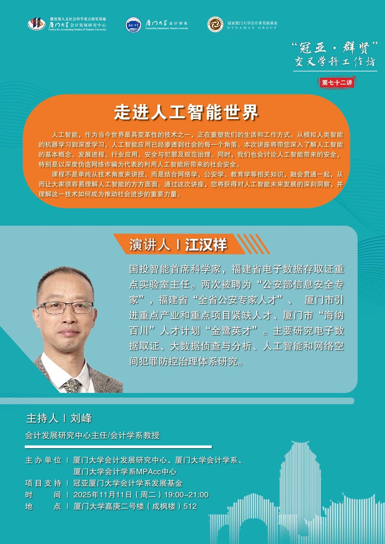 课程不是单纯从技术角度来讲授,而是结合网络学、公安学、教育学等相关知识,融会贯通一起,从而让大家很容易理解人工智能的方方面面。通过这次讲座,您将获得对人工智能未来发展的深刻洞察,并理解这一技术如何成为推动社会进步的重要力量。