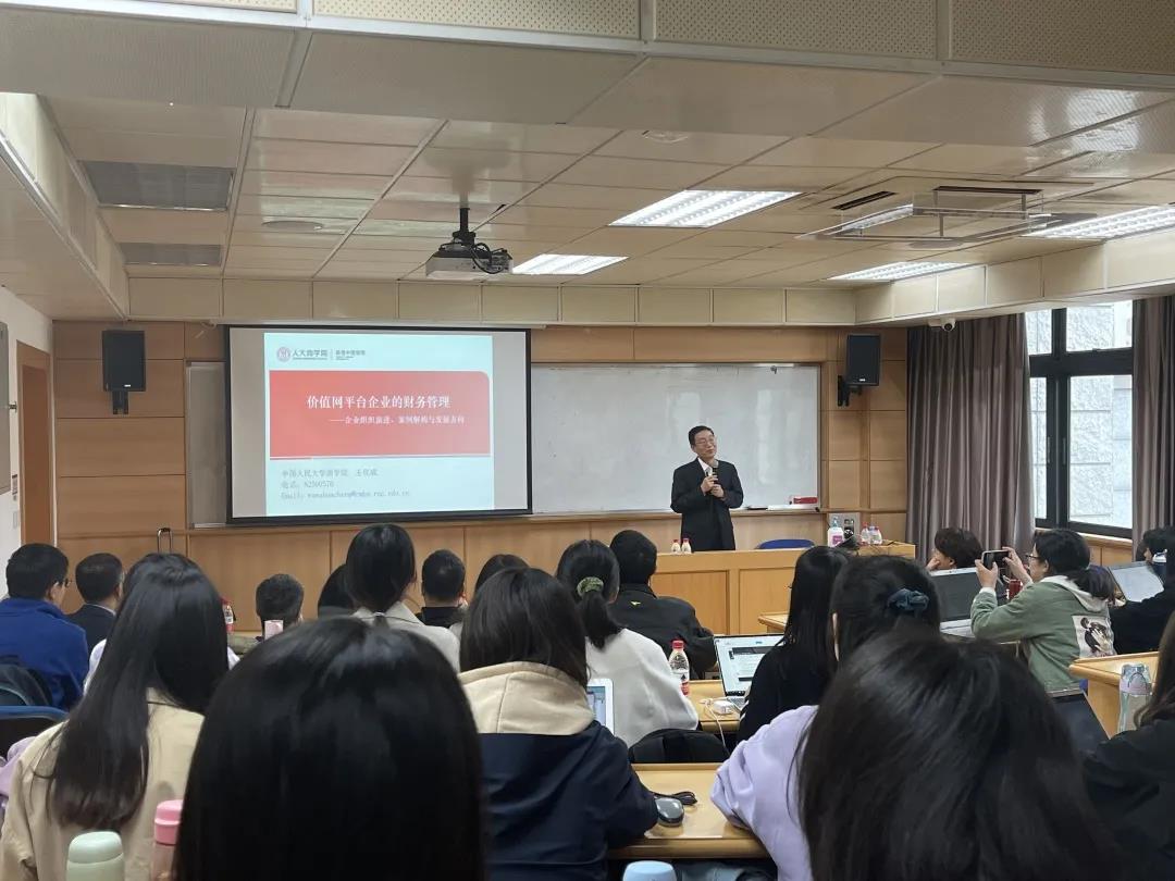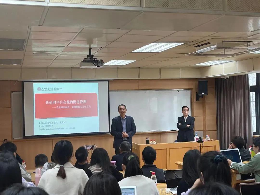 讲座的上半场,王化成教授以《价值网平台的财务管理——企业组织演进、案例解构与发展方向》为题,介绍了数智时代企业组织形式的创新发展。开篇,王教授分享了自己将白居易先生的《大林寺桃花》改编而成的小诗《大数据平台》“人间四月芳菲尽,数字之花始盛开,长恨价值无觅处,不知转入平台来”,风趣幽默地点出了上半场讲座的主题。
