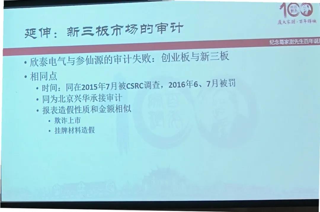 在第四部分,刘峰老师回到了审计产生的原因和作用,指出当法律将审计“升级”为一项企业必须要购买的“服务”制度,审计的作用有所改变:自愿性制度下,审计通过提供价值服务获得收益;二在强制性制度下,审计通过“审计”来获得收益。刘老师提出可以研究在新三板提供的新研究环境中研究和关注在加入了管制等诸多因素后审计的意义。刘老师还举例了欣泰电气和参仙源审计失败的对比案例,提出了三个问题,包括新三板和主板市场有什么不同?两个市场对审计的需求有什么不一样?以及新三板市场能否用来更好地讨论管制对审计带来的影响?