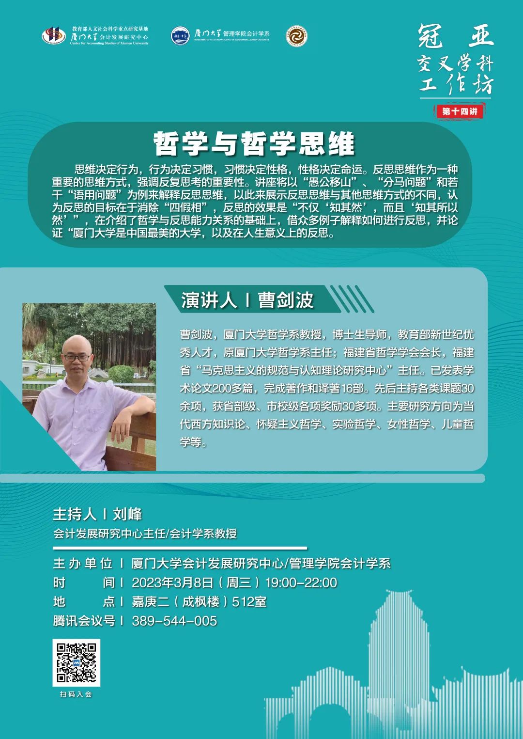 思维决定行为,行为决定习惯,习惯决定性格,性格决定命运。反思思维作为一种重要的思维方式,强调反复思考的重要性。讲座将以“愚公移山”、“分马问题”和若干“语用问题”为例来解释反思思维,以此来展示反思思维与其他思维方式的不同,认为反思的目标在于消除“四假相”,反思的效果是“不仅‘知其然’,而且‘知其所以然’”,在介绍了哲学与反思能力关系的基础上,借众多例子解释如何进行反思,并论证“厦门大学是中国最美的大学,以及在人生意义上的反思。