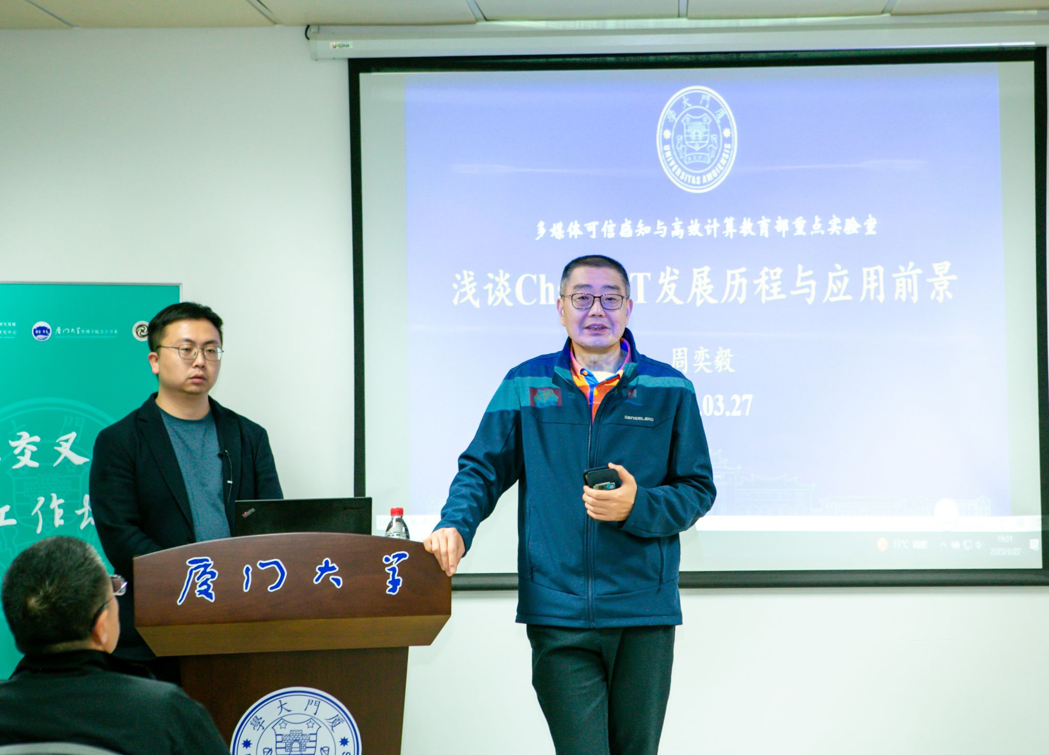 2023年3月27日晚上,第十六讲“冠亚交叉学科工作坊”在嘉庚二号楼512室线上线下同步举行。在刘峰教授的主持下,本期邀请到厦门大学信息学院博士生导师周奕毅副教授作主题为“浅谈ChatGPT发展历程与应用前景”的学术讲座。