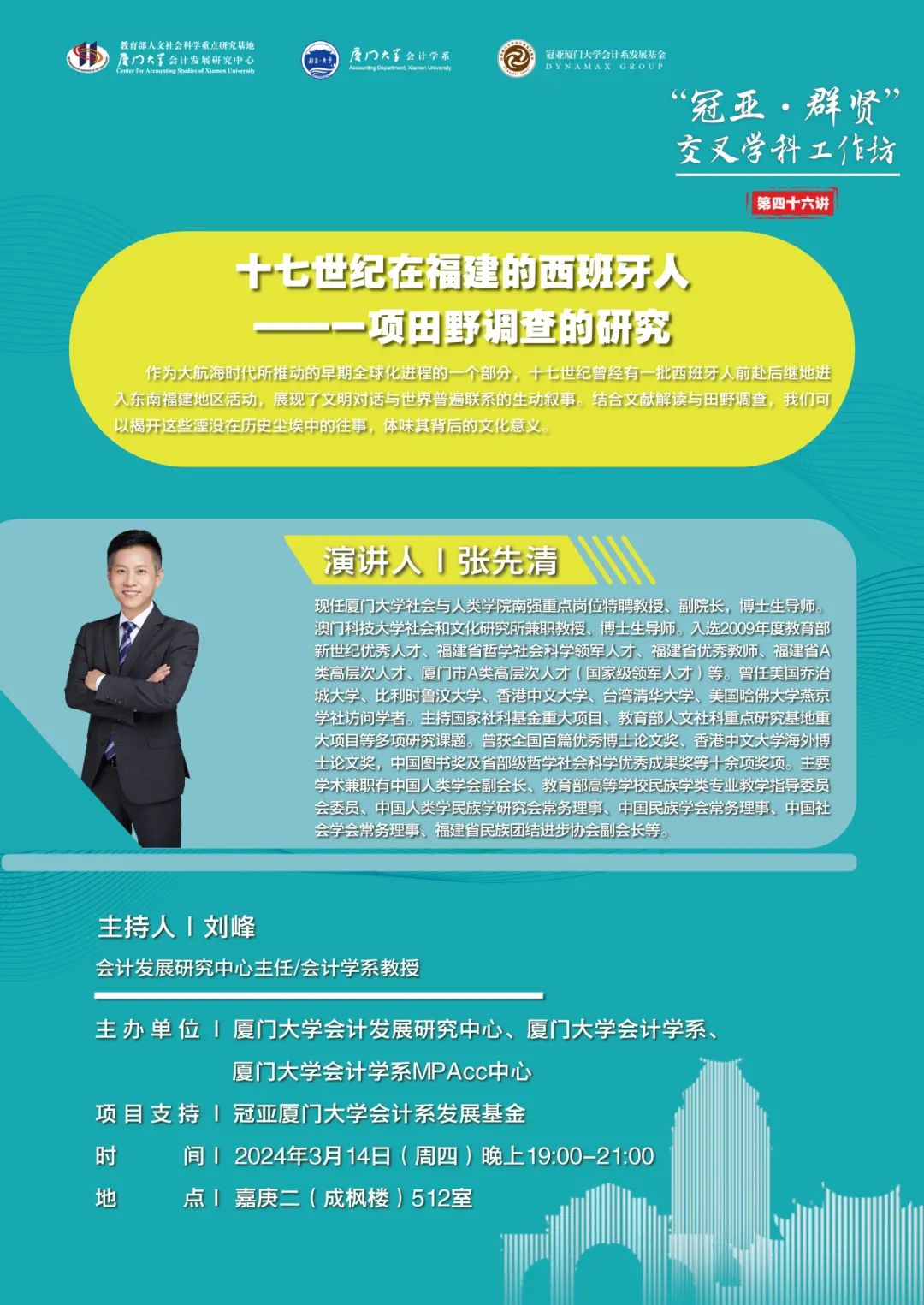 “‘冠亚·群贤’交叉学科工作坊”就是在这一背景下成立的,由教育部人文社会科学重点研究基地厦门大学会计发展研究中心和厦门大学会计学系、厦门大学会计学系MPAcc中心联合主办,并获 “冠亚厦门大学会计系发展基金”的支持。目前的计划是每月上、下旬各一次。