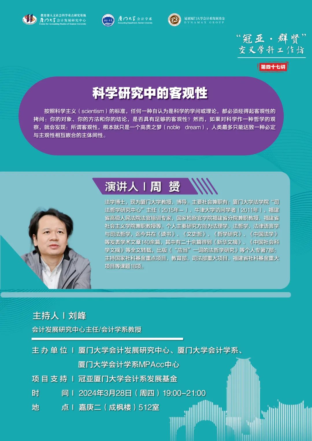 厦门大学会计学科历来注重学科交叉。2017年厦门大学会计学系设立“群贤”交叉学科论坛,已举办22期;2022年厦门大学会计发展研究中心设立“冠亚”交叉学科工作坊,已举办23期。经商定,两个交叉学科论坛自第46期起,合并为“冠亚·群贤”交叉学科工作坊,由厦门大学会计发展研究中心、厦门大学会计学系和厦门大学会计学系MPAcc中心联合主办,并获 “冠亚厦门大学会计学系发展基金”的支持。目前的计划是每月上、下旬各一次。