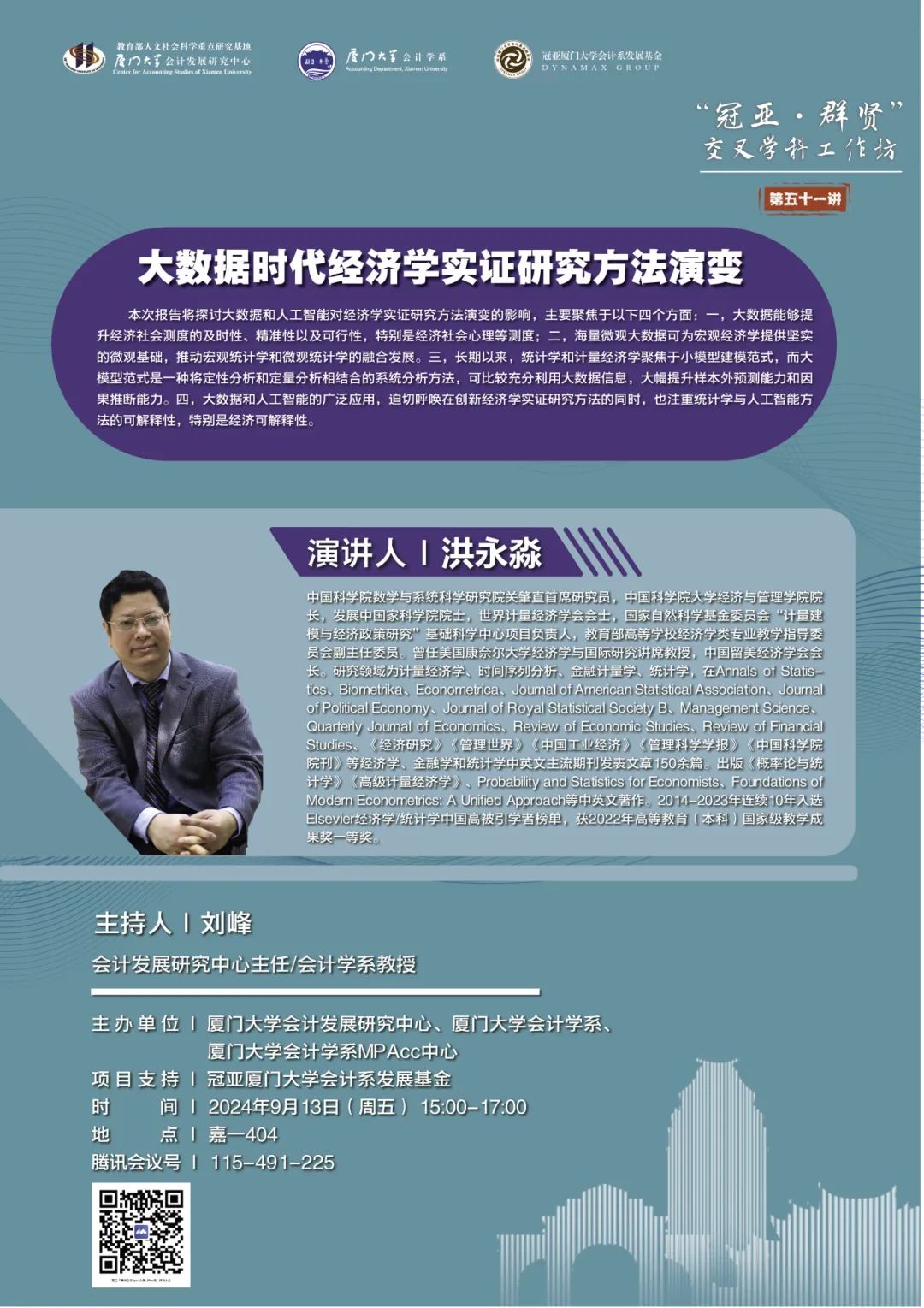 厦门大学会计学科历来注重学科交叉。2017年厦门大学会计学系设立“群贤”交叉学科论坛,已举办22期;2022年厦门大学会计发展研究中心设立“冠亚”交叉学科工作坊,已举办23期。经商定,两个交叉学科论坛自第46期起,合并为“冠亚·群贤”交叉学科工作坊,由厦门大学会计发展研究中心、厦门大学会计学系和厦门大学会计学系MPAcc中心联合主办,并获 “冠亚厦门大学会计学系发展基金”的支持。目前的计划是每月上、下旬各一次。