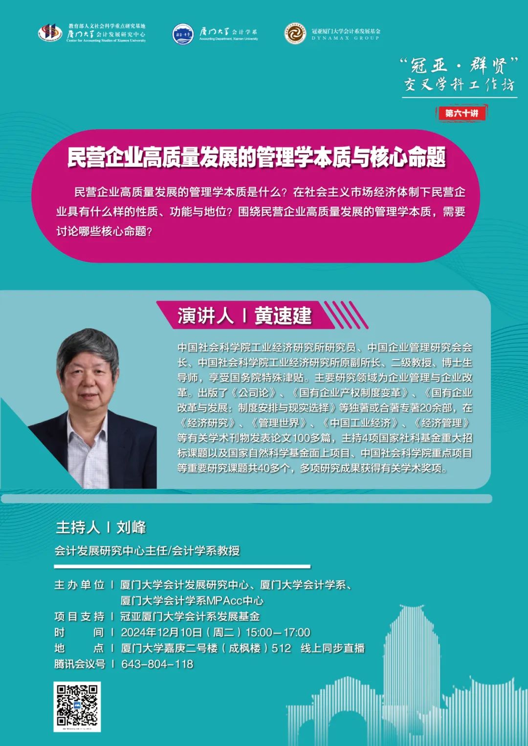 厦门大学会计学科历来注重学科交叉。2017年厦门大学会计学系设立“群贤”交叉学科论坛,已举办22期;2022年厦门大学会计发展研究中心设立“冠亚”交叉学科工作坊,已举办23期。经商定,两个交叉学科论坛自第46期起,合并为“冠亚·群贤”交叉学科工作坊,由厦门大学会计发展研究中心、厦门大学会计学系和厦门大学会计学系MPAcc中心联合主办,并获 “冠亚厦门大学会计学系发展基金”的支持。目前的计划是每月上、下旬各一次。
