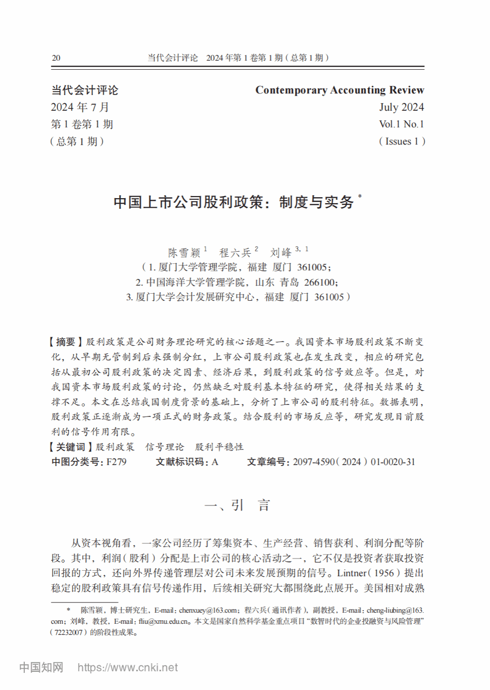厦门大学会计发展研究中心刘峰教授及团队合作的论文“中国上市公司股利政策:制度与实务”在《当代会计评论》(CN35-1352/F)2024年第1卷第1期刊发。