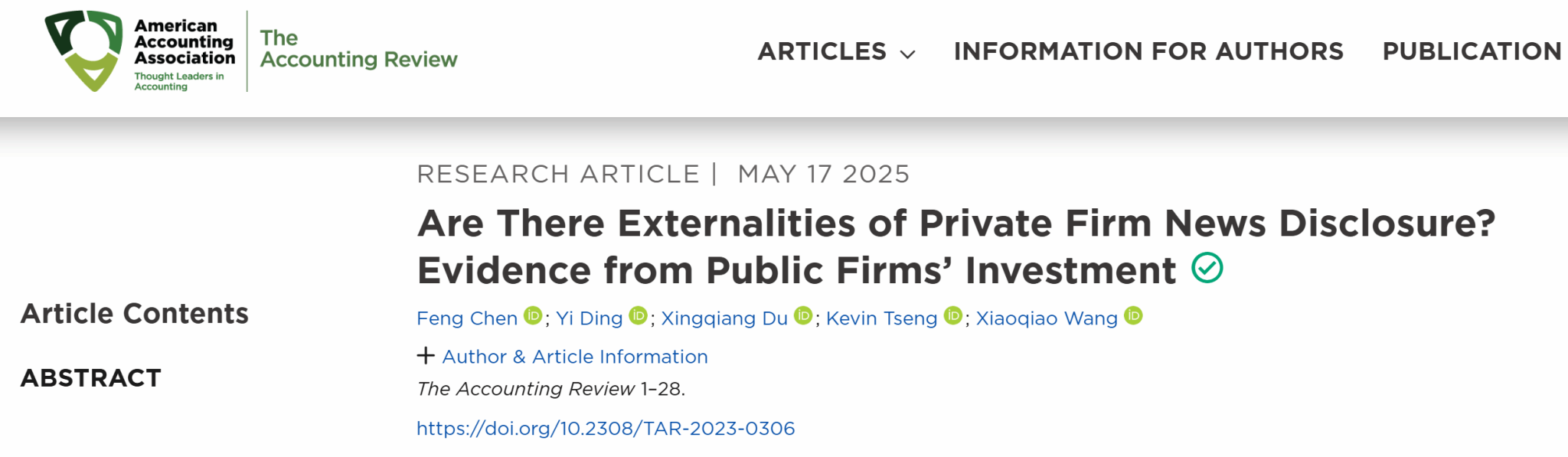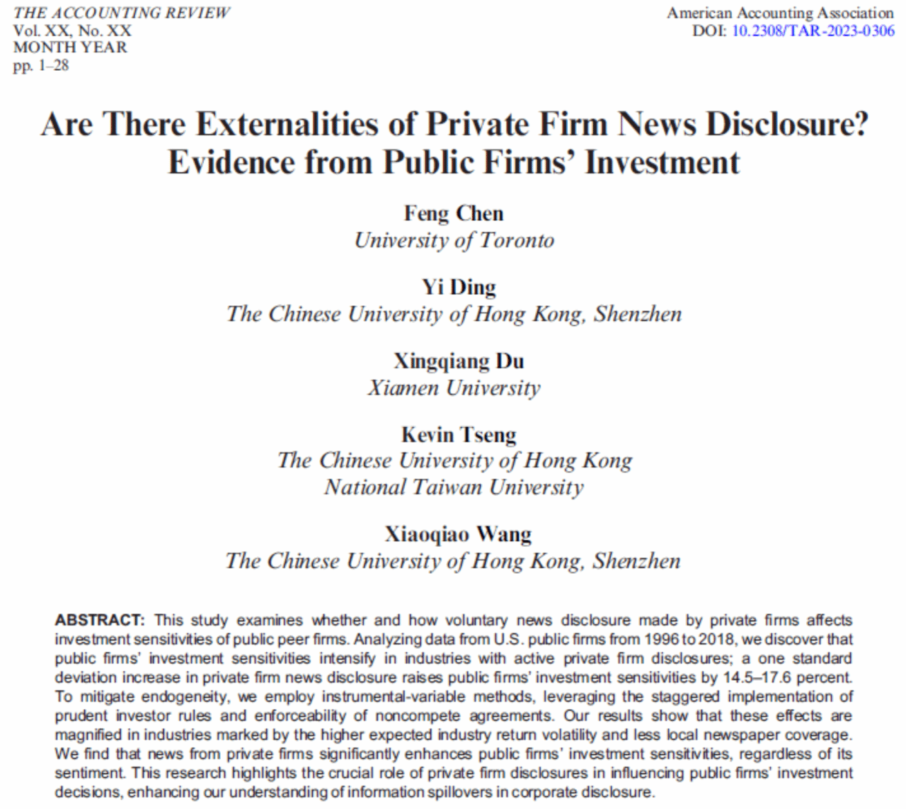 厦门大学会计学系/厦门大学会计发展研究中心杜兴强教授的合作论文 “Are There Externalities of Private Firm News Disclosure? Evidence from Public Firms’ Investment” (合作者为Feng Chen, Yi Ding, Kevin Tseng和Xiaoqiao Wang)在会计学顶尖期刊The Accounting Review(TAR; UTD24)在线刊出。