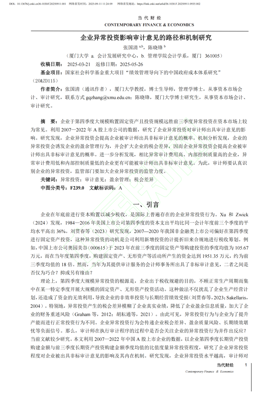 厦门大学会计发展研究中心、会计学系张国清教授和厦门大学会计学系博士研究生陈晓锋合作的论文“企业异常投资影响审计意见的路径和机制研究”,于2025年9月11日在《当代财经》网络首发。