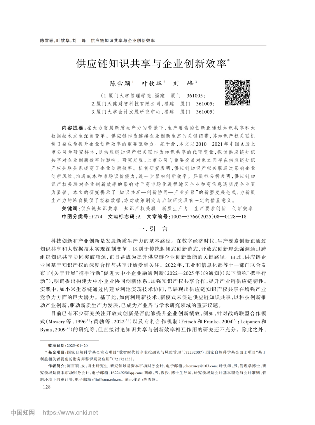 厦门大学会计发展研究中心、会计学系刘峰教授,厦门大学会计学系博士研究生陈雪颖和叶钦华博士合作的论文“供应链知识共享与企业创新效率”,于2025年9月18日在《经济管理》网络首发。