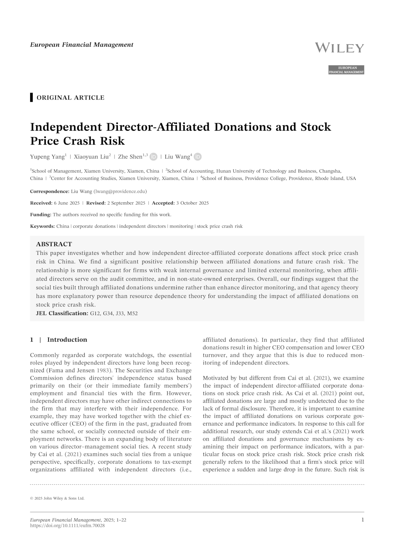 厦门大学会计发展研究中心专职研究人员沈哲教授及其团队合作的论文“Independent Director-Affiliated Donations and Stock Price Crash Risk”于2025年在European Financial Management 在线刊发。