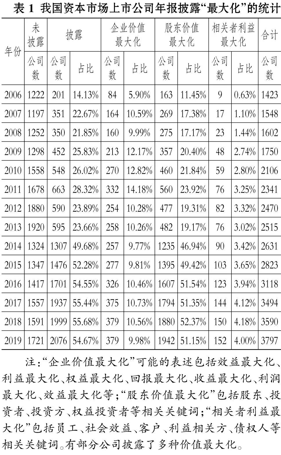 实际上,目前资本市场上很多公司都将股东价值最大化作为主要的诉求。表1列示了2006~2019年全部上市公司年报提及“最大化”的频次④。