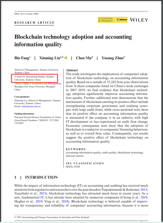 2023年4月,厦门大学会计发展研究中心/管理学院会计系刘馨茗副教授、管理科学系方斌副教授和2019级硕士生卓羽桑合作的论文“ Blockchain technology adoption and accounting information quality ”在国际期刊Accounting&Finance在线刊出。