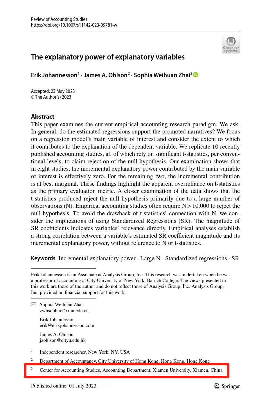 2023年7月,厦门大学会计发展研究中心/管理学院会计系翟伟欢(通讯作者)与合作者撰写的论文“The Explanatory Power of Explanatory Variables” 在会计学全球五大顶刊之一的Review of Accounting Studies上正式在线刊出。