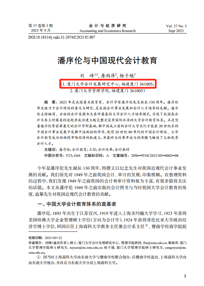 厦门大学会计发展研究中心/管理学院会计系刘峰教授、厦门大学管理学院会计学系屠雨泽硕士研究生、杨子越硕士研究生合作题为《潘序伦与中国现代会计教育》一文,在《会计与经济研究》(2023年第5期)正式刊出。