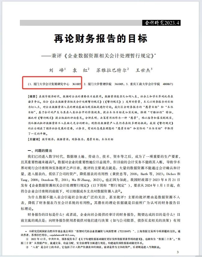 厦门大学会计发展研究中心/管理学院会计系刘峰教授、厦门大学管理学院会计学系袁红博士、苏雅拉巴特尔博士研究生以及合作者的论文《再论财务报告的目标——兼评 《企业数据资源相关会计处理暂行规定》》,在《会计研究》(2023年第4期)正式刊出。