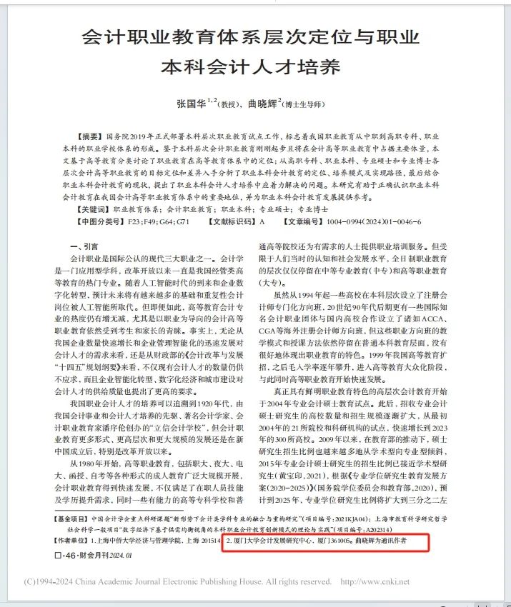 厦门大学会计发展研究中心曲晓辉教授及团队张国华教授合作的论文《会计职业教育体系层次定位与职业本科会计人才培养》,在《财会月刊》(2024年第1期)正式刊出。