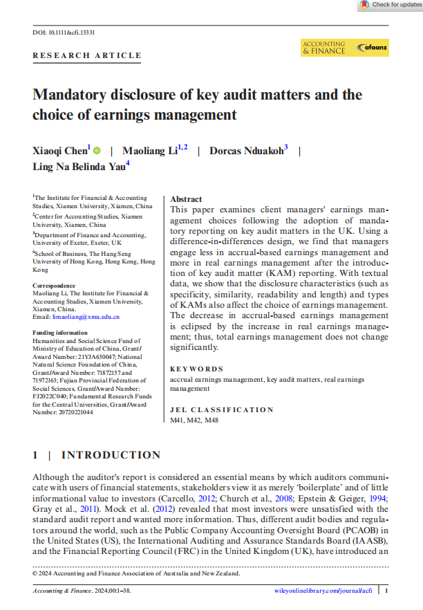 厦门大学会计发展研究中心李茂良副教授与团队合作的论文《 Mandatory disclosure of key audit matters and the choice of earnings management》在Accounting & Finance(2024)刊发。