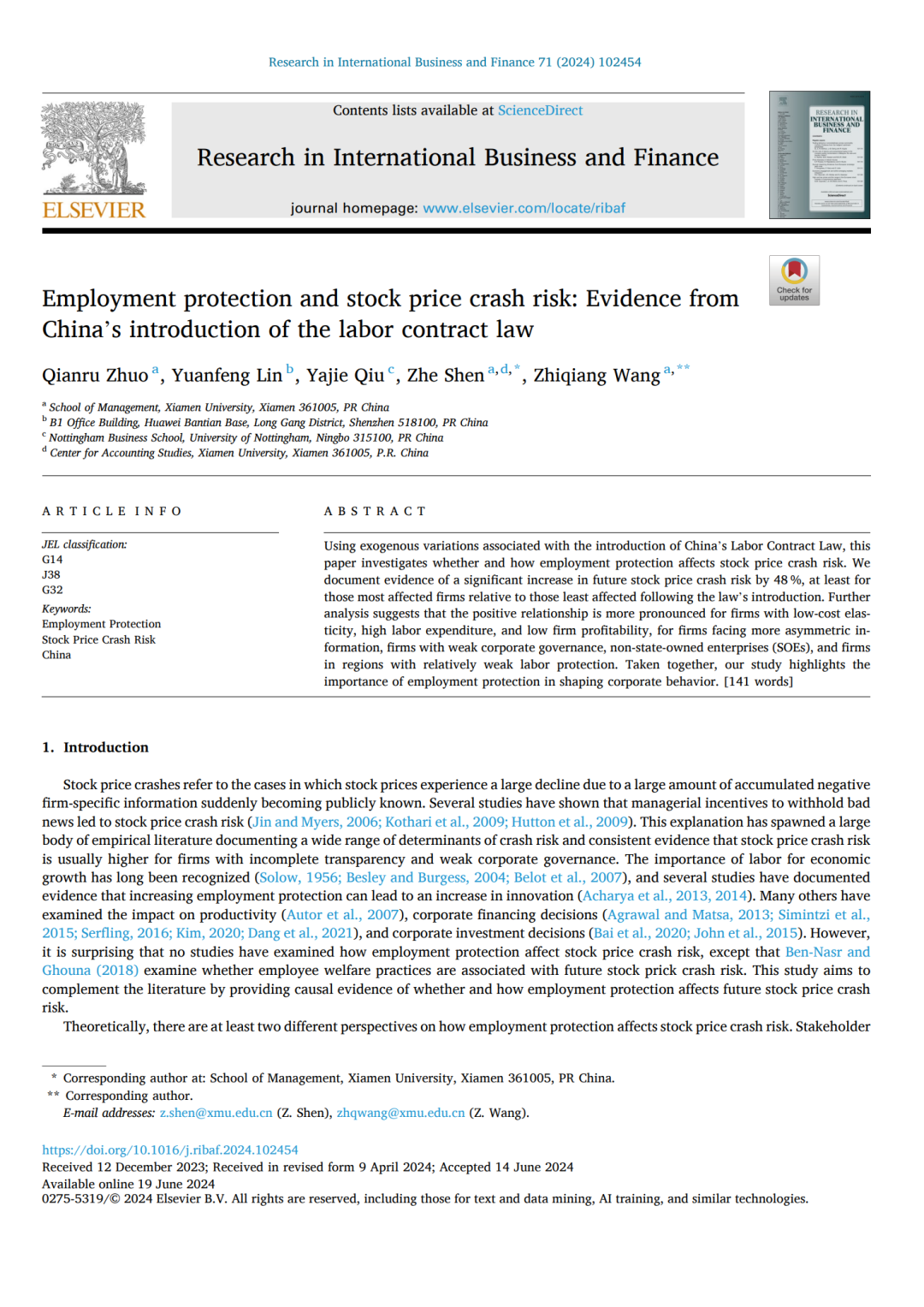 厦门大学会计发展研究中心沈哲教授与团队合作的论文“Employment protection and stock price crash risk: Evidence from China's introduction of the labor contract law”在 Research in International Business and Finance 刊发。
