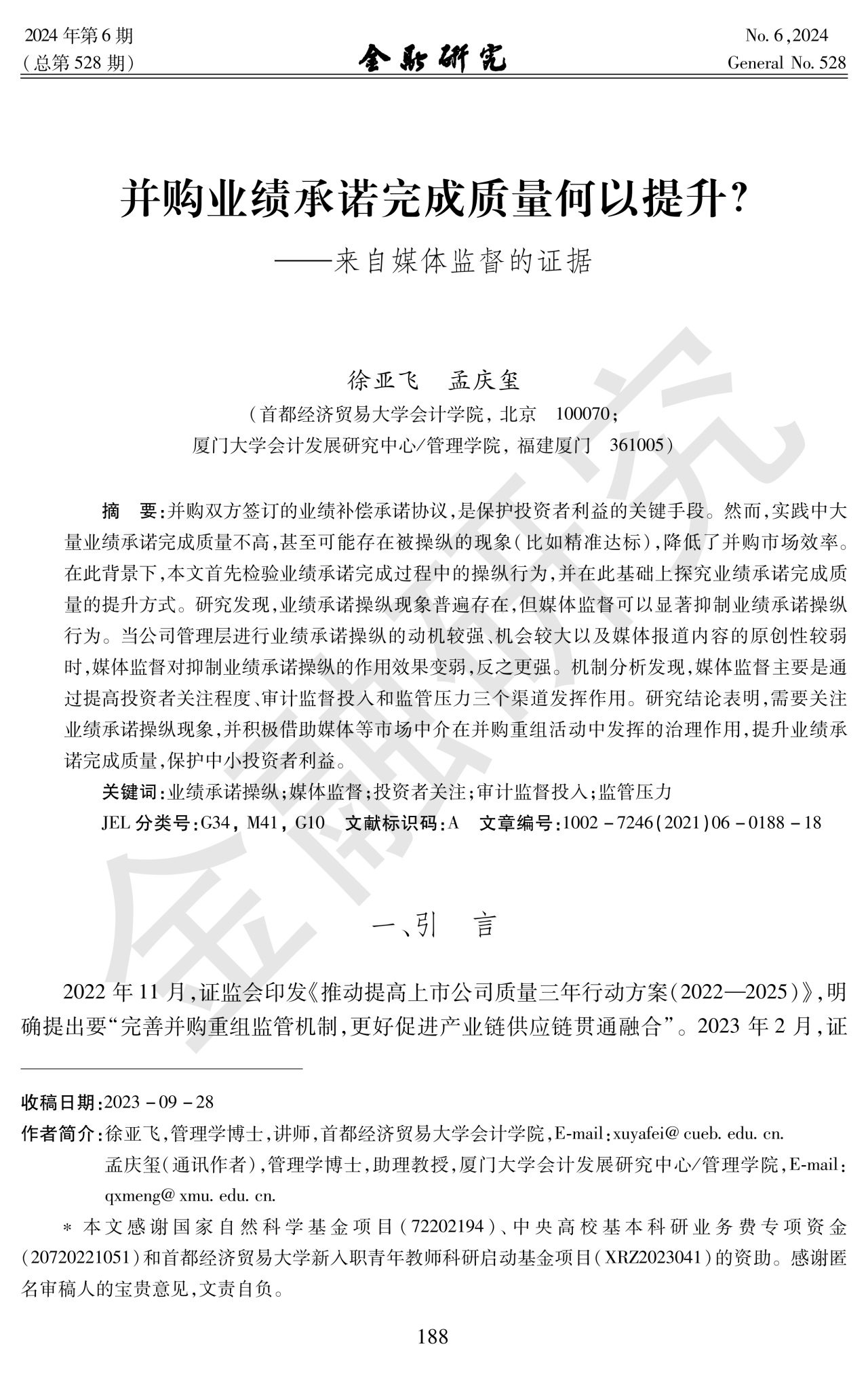 厦门大学会计发展研究中心孟庆玺助理教授与团队合作的论文“并购业绩承诺完成质量何以提升?——来自媒体监督的证据”在《金融研究》2024年第6期刊发。