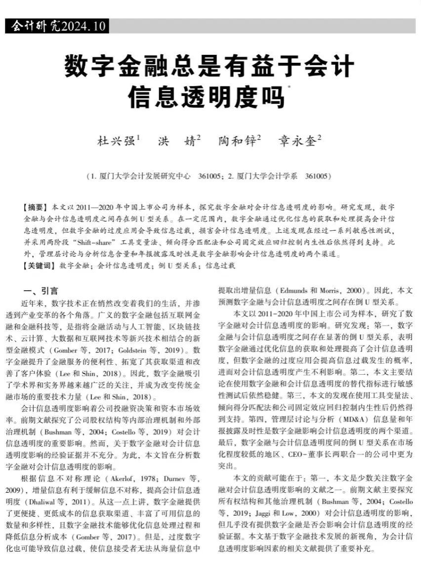 厦门大学会计发展研究中心、厦门大学会计学系杜兴强教授及团队合作的论文“ 数字金融总是有益于会计信息透明度吗”在《会计研究》2024年第10期刊发。