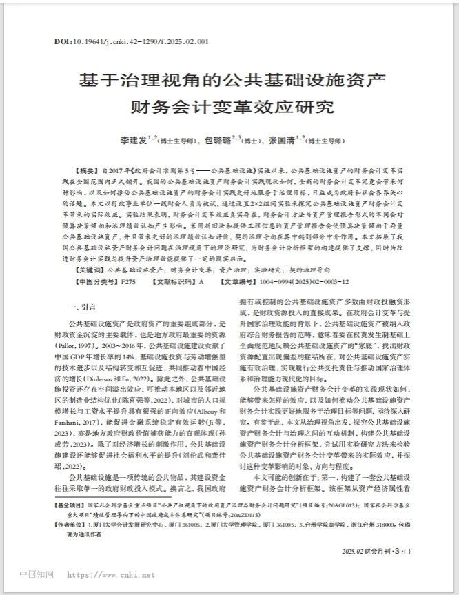 厦门大学会计发展研究中心李建发教授和张国清教授及团队合作的论文“基于治理视角的公共基础设施资产财务会计变革效应研究”在《财会月刊》2025年第2期刊发。