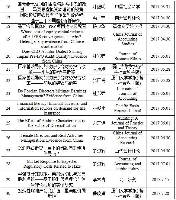 - 2017年11月17-18日,China Journal of Accounting Research(中文:中国会计学刊,简称:CJAR)在厦门大学隆重召开新制度、治理与会计国际研讨会(英文:International Symposium on Neo-Institution, Governance, and Accounting)。本次国际研讨会由厦门大学(会计发展研究中心、管理学院会计系和财务管理与会计研究院)、中山大学和香港城市大学共同主办,来自美国University of Washington(Seattle)的Terry Shevlin教授和麻省理工大学(MIT)的Michelle Hanlon教授、以及加州大学、韩国加图立大学、香港城市大学、香港科技大学、香港理工大学、复旦大学、上海财经大学、天津大学、中山大学、厦门大学等多所知名高校近60余位专家学者应邀参加本次会议。