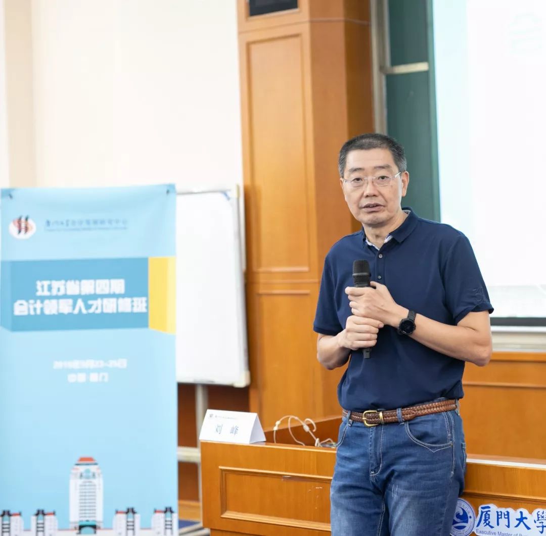 在开班仪式上,厦门大学会计发展研究中心刘峰教授进行致辞。刘教授对本次前来参加培训的江苏省会计领军人才表达了诚挚的欢迎,并对厦门大学会计学科和本次培训课程安排进行了简要的介绍。此次培训班课程安排不仅涵盖政府会计改革、会计准则变迁、管理会计数字化转型等前沿内容,还包括制度经济、台海局势分析等综合类课程。