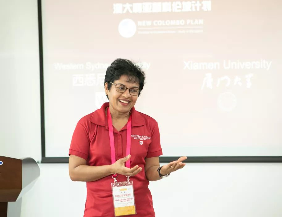活动澳方发起人之一西悉尼大学商学院的Dilupa博士上台致辞。她对厦门大学师生们的大力支持和参与表示了诚挚的感谢,希望西悉尼大学同学们能够积极参与举办的各类活动,学有所得,不虚此行。