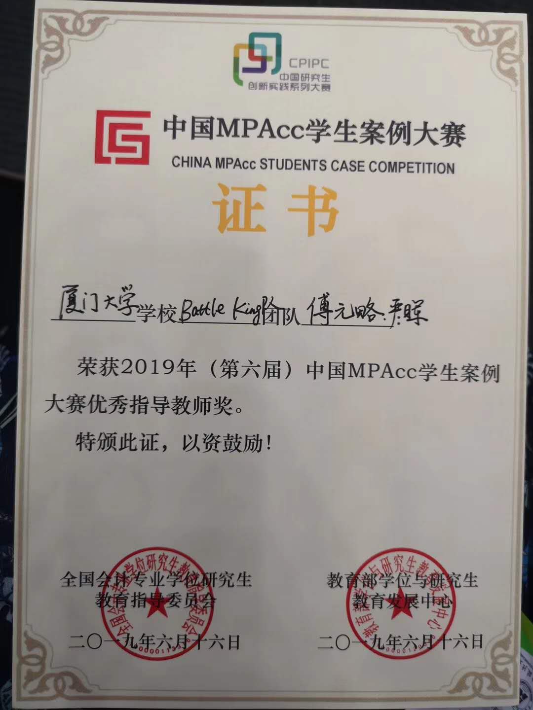 我校会计发展研究中心副主任傅元略教授和会计系严晖副教授作为指导教师,指导的以李佳虹为队长,谢嘉文、陈雨萌、代明瑞、廖安和郑邦威共6位硕士生组成Battle King队,经过四阶段的赛程,以优秀的现场表现和高质量的案例研究成果等综合评分,荣获“2019年(第六届)中国MPAcc学生案例大赛”全国特等奖;同时两位指导教师也获得案例大赛的优秀指导教师奖。