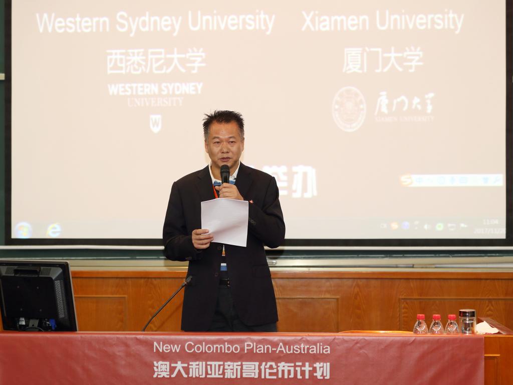 厦门大学教务处处长计国君教授首先为开幕式致辞。计国君教授对所有参与此项目的同学和老师表示欢迎,希望他们未来在厦门能共同度过两周美好的时光。接下来计国君教授对西悉尼大学和厦门大学这两座国际化的优秀学府进行了简要介绍,并对此次两校合作的新哥伦布交流项目的重要意义给予高度肯定。